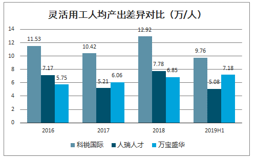 橫向對比同行企業(yè),科銳國際單位人均產(chǎn)出占優(yōu)。比較科銳國際與港股上市企業(yè)人瑞人才和萬(wàn)寶盛華,可以發(fā)現科銳國際近三年的人均產(chǎn)出均占優(yōu)。以19上半年數據為例,科銳國際、萬(wàn)寶盛華、人瑞人才的人均產(chǎn)出從高至低分別為9.76/7.18/5.08萬(wàn)/人??其J國際靈工人均產(chǎn)出的優(yōu)勢反映其收入質(zhì)量較高,可能與其派出人員的技能差異和服務(wù)行業(yè)的種類(lèi)差異有關(guān)。毛利率方面,人瑞人才和萬(wàn)寶盛華采取的靈活用工業(yè)務(wù)計算口徑為營(yíng)業(yè)收入減去直接成本(包括外包人員的相關(guān)支出,但不包括公司自有業(yè)務(wù)員工的人工成本及差旅、房租水電、電話(huà)費等)。調整會(huì )計計量口徑差異后,科銳國際19年上半年靈活用工業(yè)務(wù)毛利率為13.37%,高于人瑞人才的9.55%和萬(wàn)寶盛華的11.40%,亦說(shuō)明了科銳國際的靈活用工業(yè)務(wù)和同行相比存在溢價(jià)優(yōu)勢。