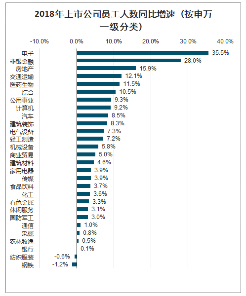 2018年上市公司員工人數同比增速(按申萬(wàn)一級分類(lèi))